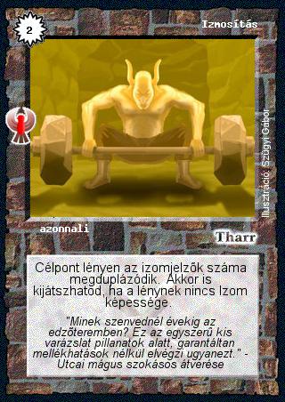 Kiadás: Ébredés Gyakoriság: gyakori Lapszín (isten): Tharr Típus: azonnali Szöveg: Célpont lényen az izomjelzők száma megduplázódik. Akkor is kijátszhatod, ha a lénynek nincs Izom képessége. Szinesítő szöveg: "Minek szenvednél évekig az edzőteremben? Ez az egyszerű kis varázslat pillanatok alatt, garantáltan mellékhatások nélkül elvégzi ugyanezt." - Utcai mágus szokásos átverése Illusztráció: