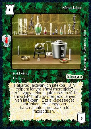 Kiadás: Ébredés, Alappakli, 8. kiadás Gyakoriság: nem gyakori Lapszín (isten): Sheran Típus: építmény Altípus: torony Szöveg: Ha akarod, aktívan jön játékba. 0 VP: célpont lényre annyi méregjelző kerül, vagy célpont játékos sebződik annyi ÉP-t, ahány mérgező lényed van játékban. Ezt a képességet körönként csak egyszer használhatod, és csak a fő fázisodban. Illusztráció: Ruzsinszki Zsolt