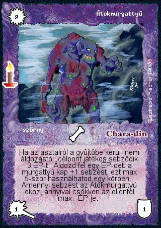 Kiadás: Múltidéző, Alappakli, 8. kiadás Gyakoriság: gyakori Lapszín (isten): Chara-din Típus: szörny Szöveg: Ha az asztalról a gyűjtőbe kerül, nem áldozástól, célpont játékos sebződik 3 ÉP-t. Áldozd fel egy ÉP-det: a murgattyú kap +1 sebzést, ezt max 5-ször használhatod egy körben. Amennyi sebzést az Átokmurgattyú okoz, annyival csökken az ellenfél max. ÉP-je. Illusztráció: Fischer Tamás